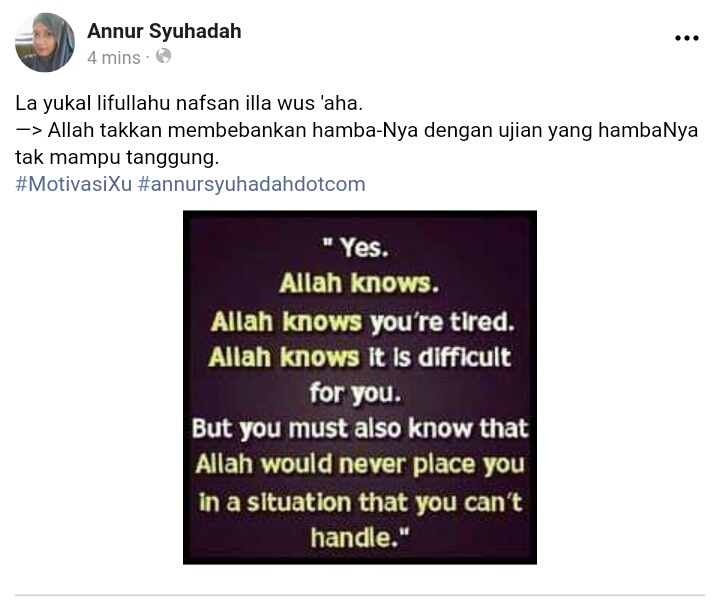 La Yukallifullahu Nafsan Illa Wus Aha Annur Syuhadah