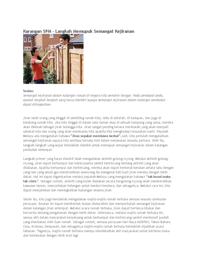 Langkah langkah memupuk semangat kejiranan spm. Semangat kejiranan semakin luntur kerana sikap masyarakat yang terlalu sibuk bekerja dari pagi hingga malam lalu tiada masa untuk bertegur sapa dengan jiran aa. Ipendidikan karangan langkah dan usaha memupuk semangat kejiranan dalam kalangan masyarakat disemak dan dikemaskini pada pukul 3 15 pm 25 jun 2020 soalan berkaitan semangat kejiranan kerap digunakan oleh sekolah untuk menguji tahap penulisan para pelajar. Melalui aktiviti gotong royong jiran dapat berkumpul dan bekerjasama sambil berbincang tentang aktiviti yang akan dilakukan. Malah amalan ziarah menziarahi ini sangat digalakkan dalam islam.
