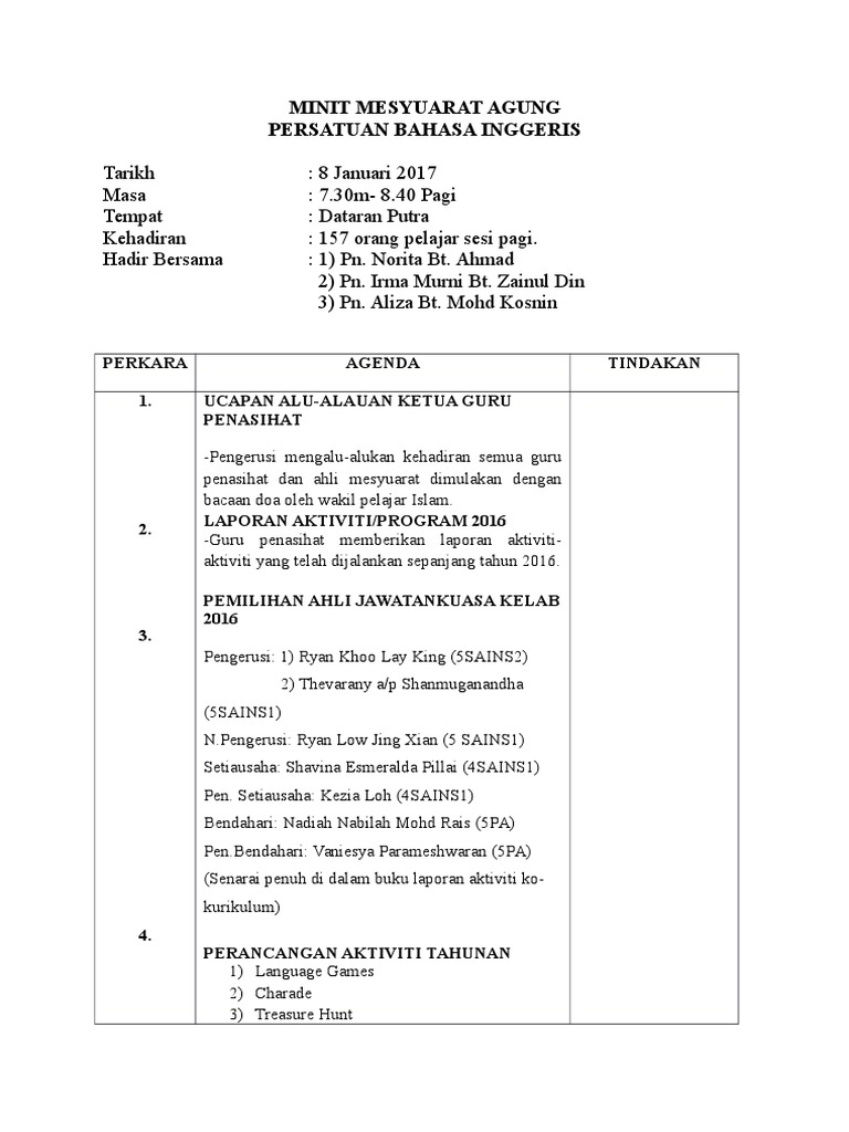 Doc Contoh Minit Mesyuarat Ajk Persatuan Bahasa Melayu Etiesha Rais Academia Edu