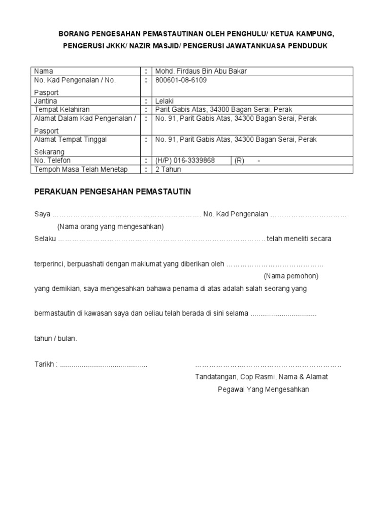 Pengesahan Pemastautinan Contoh Surat Pengesahan Bermastautin Dari Ketua Kampung