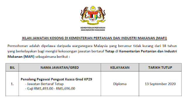 Jawatan Kosong Terkini Penolong Pegawai Penguatkuasa Kp29 Kementerian Pertanian Industri Asas Makanan Mafi Kerja Kosong Kerajaan Swasta