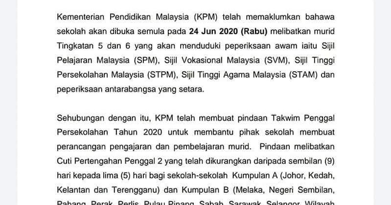 Kpm Takwim Persekolahan Pindaan Penggal Persekolahan 2020